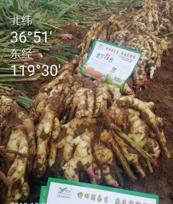 2019年10月20日,易生科技售后服務(wù)組來(lái)到昌邑,回訪(fǎng)這位農戶(hù),這位農戶(hù)說(shuō)噴施地下狂長(cháng)了五遍,效果非常好,顏色金黃光亮,姜指頭粗胖,出姜時(shí)不易破盤(pán),連接點(diǎn)粗。像這樣好的姜地里基本都是,還說(shuō)今年的大姜比往年的都好。