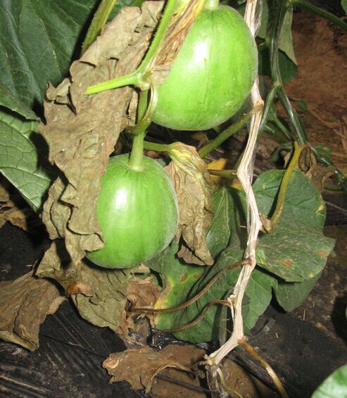 炭疽病癥狀;葉片上有輪廓型圓斑點(diǎn),后期瓜上斑點(diǎn)凹陷, |